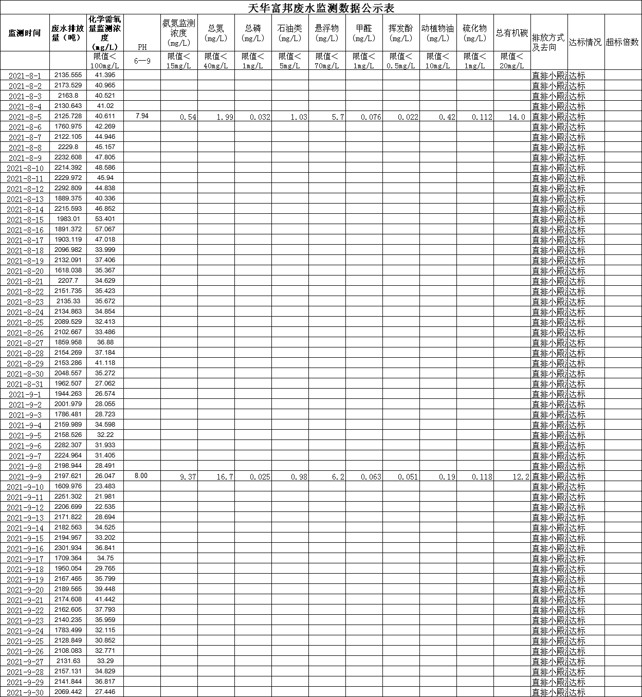 四川天華富邦化工有限責任公司8月、9月廢水監測數據公示